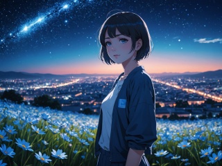 anime girl, night, blue light behind her,  ((Galaxy, Lens flare)), short hair, flower field, night sky, cinematic shot. Wallpaper. (Blue color schema), detailed background, a city in the distance