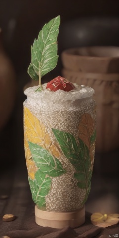 simple background, shiny, blurry, no humans, depth of field, black background, gem, crystal, realistic, red gemstone, still life,food, blurry, cup, no humans, blurry background, leaf, ice, glass, food focus, lemon, still life, ice cube