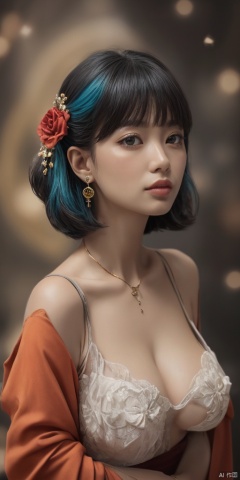 1girl,Han Chinese girls,yellow Hanfu,chinese clothes,large breasts,leaf,Black Rose,jewelry, earrings,lips, makeup, portrait, eyeshadow, realistic, nose,{{best quality}}, {{masterpiece}}, {{ultra-detailed}}, {illustration}, {detailed light}, {an extremely delicate and beautiful}, a girl, {beautiful detailed eyes}, stars in the eyes, messy floating hair, colored inner hair, Starry sky adorns hair, depth of field, large breasts,cleavage,blurry, no humans, traditional media, gem, crystal, still life, Dance,movements, All the Colours of the Rainbow,zj,