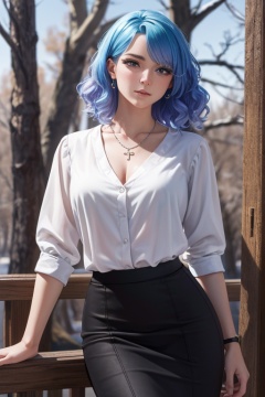 masterpiece,ultra realistic,32k,extremely detailed CG unity 8k wallpaper, best quality,(winter day ),lady ,necklace ,eardrop, Yellowstone National Park, United States, ( tiger print Wear a pencil skirt with a silk blouse ) , rainbow hair hair bob hair ,
