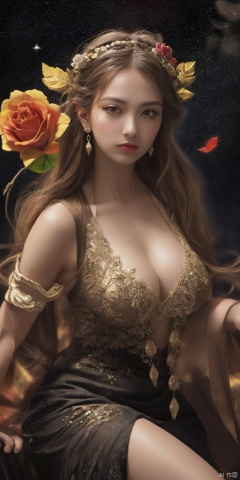 1girl,Han Chinese girls,yellow Hanfu,chinese clothes,large breasts,leaf,Black Rose,jewelry, earrings,lips, makeup, portrait, eyeshadow, realistic, nose,{{best quality}}, {{masterpiece}}, {{ultra-detailed}}, {illustration}, {detailed light}, {an extremely delicate and beautiful}, a girl, {beautiful detailed eyes}, stars in the eyes, messy floating hair, colored inner hair, Starry sky adorns hair, depth of field, large breasts,cleavage,blurry, no humans, traditional media, gem, crystal, still life, Dance,movements, All the Colours of the Rainbow,zj,