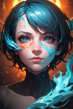 a close up of a person's face on a cracked surface, inspired by Alberto Seveso, featured on zbrush central, orange fire/blue ice duality!, portrait of an android, fractal human silhouette, red realistic 3 d render, blue and orange, subject made of cracked clay, woman, made of lava
