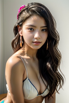 hwgirl,Create a Masterpiece of an ultra-detailed illustration, Sensation, Short, Firm, Triangular Face, Fair Skin, Gray Hair, Blue Eyes, [[Curved Nose]], Thick Lips, Receding Chin, Shoulder-Length Hair, Thick Hair, Double Braided Crown, asymmetrical breasts, Hoop earrings, hot pink cream lipstick, Color Field Painting, vivid, hands behind back, swinging, Tilting, Supernatural,<lora:Hwgirl_V01:0.6>,