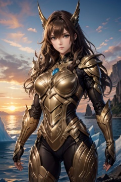 <lora:Hxarmour_00703:0.7>,Hands on face,, hxarmour,1girl,(brown armour:1.3),Ocean Crater Lake,Iceberg,Sunrise,