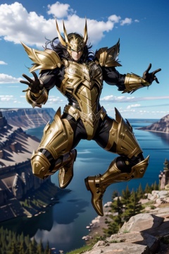 <lora:Hxarmour_00703:0.7>,Jumping,hxarmour,1[girl|man],(light green armour:1.3),Crater Lake Summit,