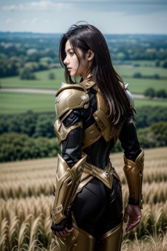 <lora:Hxarmour_00703:0.7>,Looking over the shoulder,hxarmour,1[girl|man],(dark orange armour:1.3),Rural Landscape Soda Straw,Field,