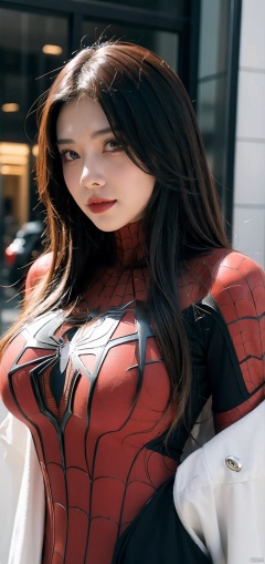 Beautiful woman detailed defined body using spider man cosplay, big breasts