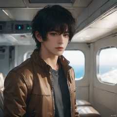 1boy,black hair,blurry background,depth of field,grey eyes,hair between eyes,jacket,lips,looking at viewer,indoor,standing,nose of an airplane,nose,open clothes,open jacket,realistic,shirt,Long hair,solo,upper body,zipper