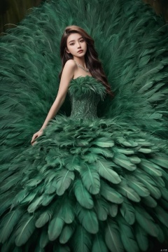 1girl,a gorgeous long dress made of feathers,green feather,huge feathers,complex background,beautiful background,(feathers everywhere:1.3),depth of field level,
