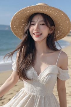 masutepiece, Best Quality, Ultra-detailed, finely detail, hight resolution, 8K Wallpaper, Perfect dynamic composition, Natural Color Lip, Korean girl, laugh, (wearing a straw hat and a dress:1.1), (Long hair:1.3), (The wind blows my long hair:1.3), breasts, dynamic pose, facing reality, 20 years girl, fullbody shot, Realism, coast background,