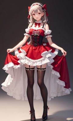1girl,bow,dress,grey background,red bow,full body,frills,simple background,solo,thighhighs,ribbon,frilled dress,hair bow,red dress,, (extremely detailed CG unity 8k wallpaper),(((masterpiece))),(((best quality))),((ultra-detailed)),(best illustration),(best shadow),
