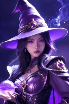 (Witch, purple wizard's hat, shows purple potion:1.4), solo, hanfu,