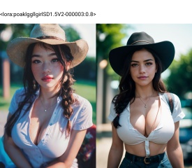 poakl ggll girl,cinematic film still (8k, RAW photo, best quality, masterpiece:1.2),ultra-detailed,(high detailed skin:1.2),8k uhd,dslr,soft lighting,high quality,smiling,((deep_cleavage, blush)) ,<lora:RDR2Sadie:0.85>, rdr2sadie,1girl,freckles,braid,shirt,cowboy hat,long hair,looking at viewer,rolled_up_sleeves,pants,white shirt,. shallow depth of field,vignette,highly detailed,high budget,bokeh,cinemascope,moody,epic,gorgeous,film grain,grainy,<lora:poaklggllgirlSD1.5V2-000003:0.8>,