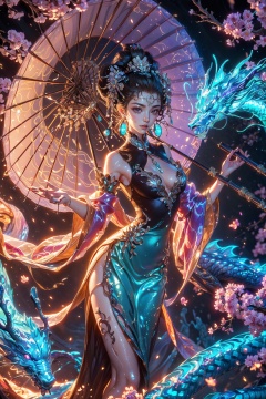 1girl bare shoulders black hair blue fire boat brown hair *** caustics cherry blossoms dress earrings fire fish flame flower glowing goldfish hair ornament holding jewelry lake lantern leaf lily pad long hair magic makeup night ocean oil-paper umbrella outdoors parasol pond pool puddle ripples river shore soaking feet solo splashing standing standing on liquid sunset tree umbrella wading water water drop waves