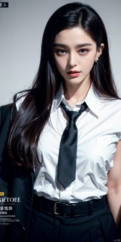 solo, looking at viewer, shirt,white shirt, necktie, collared shirt, pants, black pants, formal, suit, black necktie, watch, wristwatch, black suit, full body,,Visual impact,A shot with tension,(upper body:1.0), sideways glance,cold attitude,