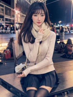 1girl,fashion model,female focus,(masterpiece, realistic, best quality, highly detailed, profession),asian,pretty,Charming eyes,exquisite facial features,bangle,sweater,scarf,skirt,black stockings,boots,sitting,night,neon,beach of city,new year,cinematic composition,,blurry,plns,sw, fireworks