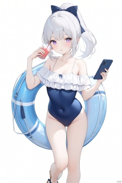 miyakoBA,long hair,bangs,holding,purple eyes,collarbone,swimsuit,full body,ponytail,white hair,frills,off shoulder,bag,one-piece swimsuit,covered navel,alternate hairstyle,phone,sandals,school swimsuit,cellphone,smartphone,innertube,blue one-piece swimsuit,frilled swimsuit,miyakoSwimsuit