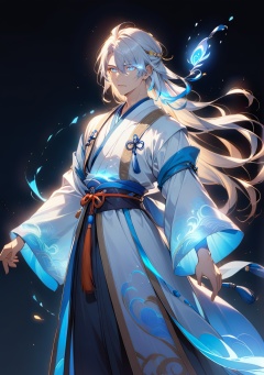 1boy, dynamic posture wearing Hanfu, long hair,Upper body, glowing text, transparent text, energy text, energy fluid, glowing, dawn, light particle effect, floating energy scroll, blue energy, best quality, masterpiece, 8k, transparent text, negative_hand