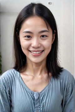 1girl, solo, looking at viewer, smile, open mouth, black hair, brown eyes, upper body, teeth, grin, black eyes, realistic, no makeup