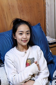 1girl, solo, long hair, looking at viewer, smile, shirt, black hair, long sleeves, sitting, sweater, lips, pillow, realistic, white sweater