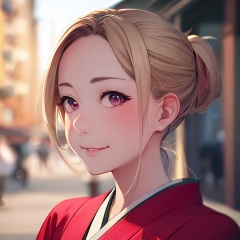 Cute, japanese, asian, kawaii, 8k, 18, kimono, girl, frontal shot, ultra detailed, ultra realistic, 85mm lens, f/ 1. 8, accent lighting, portrait, face, extreme close up, public street, day, skinny, hair ponytail, pastel, blonde, goddess --ar 9:16 --s 1000 --v 5
