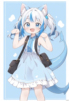 1girl, solo, looking at viewer, blush, smile, open mouth, bangs, blue eyes, shirt, dress, animal ears, twintails, blue hair, tail, white shirt, :d, grey hair, multicolored hair, frills, teeth, sleeveless, virtual youtuber, cat ears, bag, side ponytail, official alternate costume, streaked hair, animal ear fluff, hands up, sleeveless dress, blue dress, upper teeth only, blue background, sharp teeth, paw pose, shoulder bag, fish tail, shark tail, shark girl, cube hair ornament, gawr gura