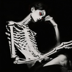 qzzd, solo, skeleton, red eyes, sitting, 1girl, short hair, black background, black hair, bone, ribs, spine, 1boy