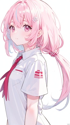 1girl, solo, simple background, white background, shirt, upper body, white shirt, multicolored hair, pink eyes, medium hair, closed mouth, from side, bangs