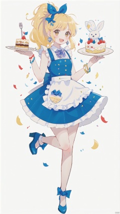 1girl, solo, long hair, blush, smile, open mouth, skirt, blonde hair, simple background, shirt, hair ornament, white background, bow, ribbon, holding, brown eyes, jewelry, standing, full body, hair ribbon, yellow eyes, white shirt, ponytail, flower, :d, hair bow, earrings, frills, food, shoes, sleeveless, bowtie, apron, high heels, bracelet, blue skirt, sleeveless shirt, fruit, blue bow, stuffed toy, leg up, white footwear, standing on one leg, stuffed animal, frilled skirt, cake, teddy bear, rabbit, spoon, fork, stuffed bunny, confetti, string of flags, pennant