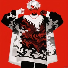 qzzd, 1boy, male focus, solo, long sleeves, cowboy shot, jewelry, short hair, red background, white hair, sweater, red eyes, necklace, pants, looking at viewer, sleeves past wrists, shirt, standing