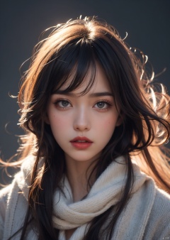 1girl, blue eyes, black hair, realistic, scarf, looking at viewer, twintails, solo, lips, long hair, portrait, nose, closed mouth, solo focus, finger to mouth, simple background, traditional media, pov, purple scarf, close-up, mole, blue background, bangs, signature, upper body, parted lips, out of frame, red lips, hair between eyes, pov hands, open mouth, blush, makeup, brown hair, grey background, eye focus, lipstick, realistic details, surrealistic, sense of reality, intense contrast of light and shadow