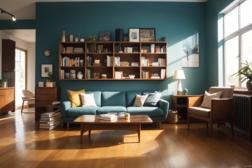 oia stunning,wooden floor, teal wall, modern furniture, Scandinavian interior design, hexagonal art prints, nature illustrations, deer, trees, mountains, sun, gradient, color blocking, minimalistic style, indoor plant, ceramic vase, floor lamp, angled legs, wood grain texture, mid-century modern, bookshelf styling, framed artwork