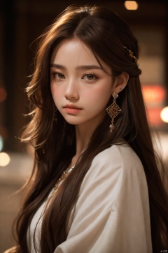 sdmai, fanhua, 1girl, solo, long hair, jewelry, earrings, looking at viewer, blurry, lips, realistic, brown hair, hoop earrings, depth of field, brown eyes
