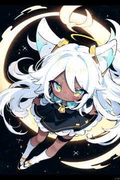 white hair, yellow eyes, aqua eyes, looking up, stockings, dark skin, long hair, hime cut, messy hair, floating hair, demon wings, halo, cross necklace, holy, divinity, shine, holy light, cat girl, (loli), (petite), solo, cozy anime, houtufeng, letterboxed