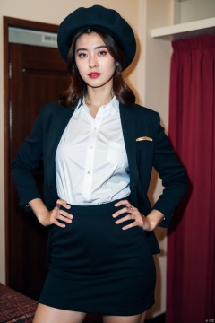 PHOTOREALISTIC REALISTIC,masterpiece,best quality,highres,ultra detailed,8k,1woman,cowboy shot,hands on hips,strobe lighting,stewardess outfit,stewardess hat,serious,makeup,lipstick,hotel room,