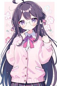 1girl,solo,braid,long hair,brown hair,hair ornament,purple eyes,shirt,ahoge,school uniform,cardigan,floral background,very long hair,pink cardigan,looking at viewer,flower,hairclip,ribbon,sleeves past wrists,off shoulder,plaid,neck ribbon,bangs,red ribbon,plaid skirt,closed mouth,collared shirt,adjusting eyewear,