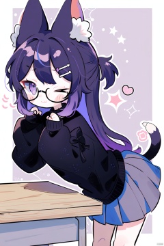 1girl, solo, long hair, looking at viewer, blush, smile, bangs, skirt, brown hair, shirt, hair ornament, long sleeves, animal ears, closed mouth, school uniform, purple eyes, tail, purple hair, heart, multicolored hair, pleated skirt, one eye closed, glasses, hairclip, cat ears, black skirt, sweater, streaked hair, cat tail, animal ear fluff, sleeves past wrists, hands up, leaning forward, cat girl, desk, grey skirt, black-framed eyewear, school desk, black sweater, tail raised, chalkboard, diagonal stripes
