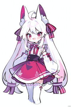 petite,1girl, solo, long hair, looking at viewer, blush, smile, open mouth, skirt, simple background, red eyes, thighhighs, white background, animal ears, very long hair, ahoge, white hair, :d, detached sleeves, japanese clothes, zettai ryouiki, fox ears, ribbon trim, ribbon-trimmed sleeves, pink thighhighs, animal on shoulder