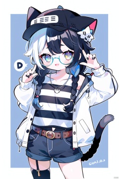 1girl, solo, long hair, looking at viewer, smile, open mouth, bangs, blue eyes, shirt, black hair, long sleeves, hat, bow, animal ears, standing, tail, yellow eyes, braid, white hair, hair bow, multicolored hair, cowboy shot, glasses, shorts, striped, belt, cat ears, nail polish, twin braids, two-tone hair, cat tail, animal ear fluff, short shorts, black headwear, black bow, heterochromia, denim, cat girl, baseball cap, blue nails, denim shorts, striped shirt, round eyewear