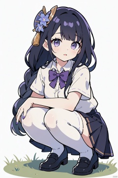 1girl, solo, raiden shogun, thighhighs, shirt, skirt, hair ornament, white thighhighs, squatting, purple nails, short sleeves, white shirt, purple skirt, black footwear, white background, bow, purple bow, collared shirt, looking at viewer, purple bowtie, bowtie, school uniform, grass, shoes, full body, parted lips, pleated skirt, flower, hair flower, loafers, simple background, hands on own knees,