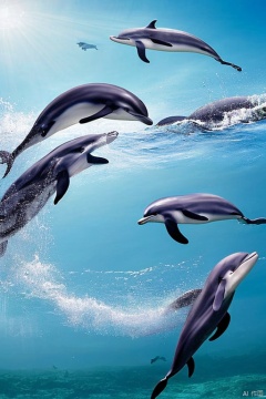Magical dreams, landscapes, photorealestic, Illustration of dolphins swimming in colorful waters, Look up at the composition, Jellyfish and whales