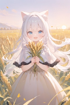 (drawn by Lynn Okamoto),center frame, sharp focus, (panorama, wide shot), best quality, masterpiece, extremely detailed, detailed background, (from above:1.2), 1girl, catgirl,solo,loli,blue eyes,white hair, closed one eye, smile, open mouth, skirt, long hair, wavy hair, on side, fluffy hair, , french , blush, smile, capelet, lace trim, bodice, sunset, long dress, dusk, scenery, gold sky, high place, horizon, wheat field, wheat ears, wind, wind blow, looking at viewer, (depth of field), bokeh, (holding a flower:1.3), (holding:1.2),(medium):0.5,