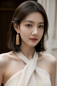 hwgirl,<lora:Hwgirl_V03:0.8>,best quality,realistic,masterpiece,photography,portrait, Madam, Tall, Thin, Diamond-Shaped Face, Tan Skin, Golden Blonde Hair, turquoise Eyes, Long Nose, Thin Lips, Round Chin, Shoulder-Length Hair, Straight Hair, Twisted Bun, perky breasts, Hoop earrings, beige metallic lipstick, A structured jumpsuit with espadrilles and a scarf, whispering, ambient light, sunny, Analogous,close_up,