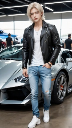 1boy, leather jacket, tight fitting T-shirt, ripped jeans, fashionable boots, white long hair, airplane head, bracelet, (supercar: 1.3), super mech ****, auto show