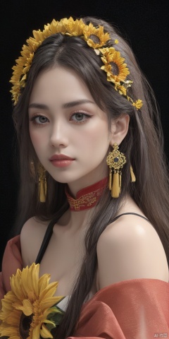 1girl,Han Chinese girls,yellow Hanfu,chinese clothes,large breasts,sunflower,jewelry, earrings,lips, makeup, portrait, eyeshadow, realistic, nose,{{best quality}}, {{masterpiece}}, {{ultra-detailed}}, {illustration}, {detailed light}, {an extremely delicate and beautiful}, a girl, {beautiful detailed eyes}, stars in the eyes, messy floating hair, colored inner hair, Starry sky adorns hair, depth of field, large breasts,cleavage,blurry, no humans, traditional media, gem, crystal, still life, Dance,movements, All the Colours of the Rainbow,zj,