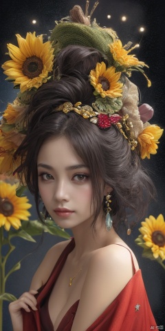 1girl,Han Chinese girls,yellow Hanfu,chinese clothes,large breasts,sunflower,jewelry, earrings,lips, makeup, portrait, eyeshadow, realistic, nose,{{best quality}}, {{masterpiece}}, {{ultra-detailed}}, {illustration}, {detailed light}, {an extremely delicate and beautiful}, a girl, {beautiful detailed eyes}, stars in the eyes, messy floating hair, colored inner hair, Starry sky adorns hair, depth of field, large breasts,cleavage,blurry, no humans, traditional media, gem, crystal, still life, Dance,movements, All the Colours of the Rainbow,zj,