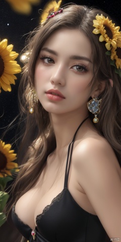 1girl,Han Chinese girls,yellow Hanfu,chinese clothes,large breasts,sunflower,jewelry, earrings,lips, makeup, portrait, eyeshadow, realistic, nose,{{best quality}}, {{masterpiece}}, {{ultra-detailed}}, {illustration}, {detailed light}, {an extremely delicate and beautiful}, a girl, {beautiful detailed eyes}, stars in the eyes, messy floating hair, colored inner hair, Starry sky adorns hair, depth of field, large breasts,cleavage,blurry, no humans, traditional media, gem, crystal, still life, Dance,movements, All the Colours of the Rainbow,zj,
