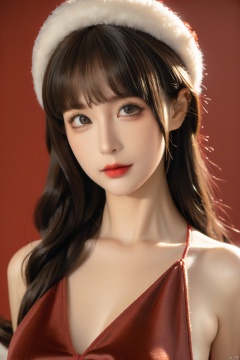 masterpiece, best quality, 1girl, red background, black hair, Long curly hair, face front, ((red fashion silk lone costume with red swirling vortexes pattern)), ((Red Plush Fur Hat)), emotional face, (close up portrait), make up, studio light, studio, ((poakl)), poakl ggll girl