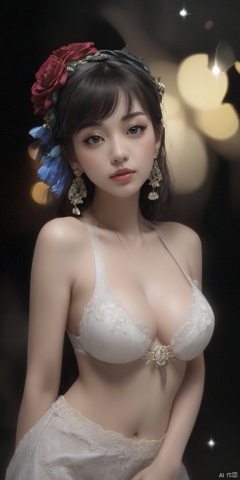 1girl,Han Chinese girls,Flower beret,yellow Hanfu,chinese clothes,large breasts,red rose,jewelry, earrings,lips, makeup, portrait, eyeshadow, realistic, nose,{{best quality}}, {{masterpiece}}, {{ultra-detailed}}, {illustration}, {detailed light}, {an extremely delicate and beautiful}, a girl, {beautiful detailed eyes}, stars in the eyes, messy floating hair, colored inner hair, Starry sky adorns hair, depth of field, large breasts,cleavage,blurry, no humans, traditional media, gem, crystal, still life, Dance,movements, All the Colours of the Rainbow,zj,
