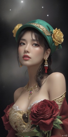 1girl,Han Chinese girls,Flower beret,yellow Hanfu,chinese clothes,large breasts,red rose,jewelry, earrings,lips, makeup, portrait, eyeshadow, realistic, nose,{{best quality}}, {{masterpiece}}, {{ultra-detailed}}, {illustration}, {detailed light}, {an extremely delicate and beautiful}, a girl, {beautiful detailed eyes}, stars in the eyes, messy floating hair, colored inner hair, Starry sky adorns hair, depth of field, large breasts,cleavage,blurry, no humans, traditional media, gem, crystal, still life, Dance,movements, All the Colours of the Rainbow,zj,